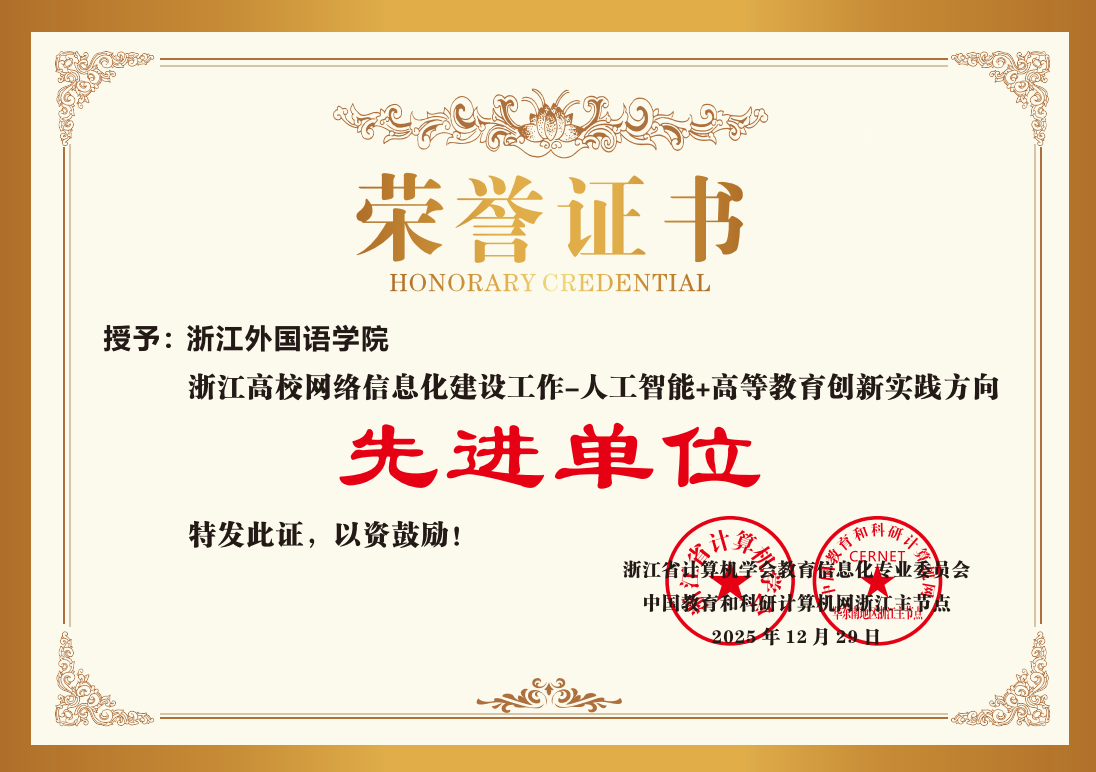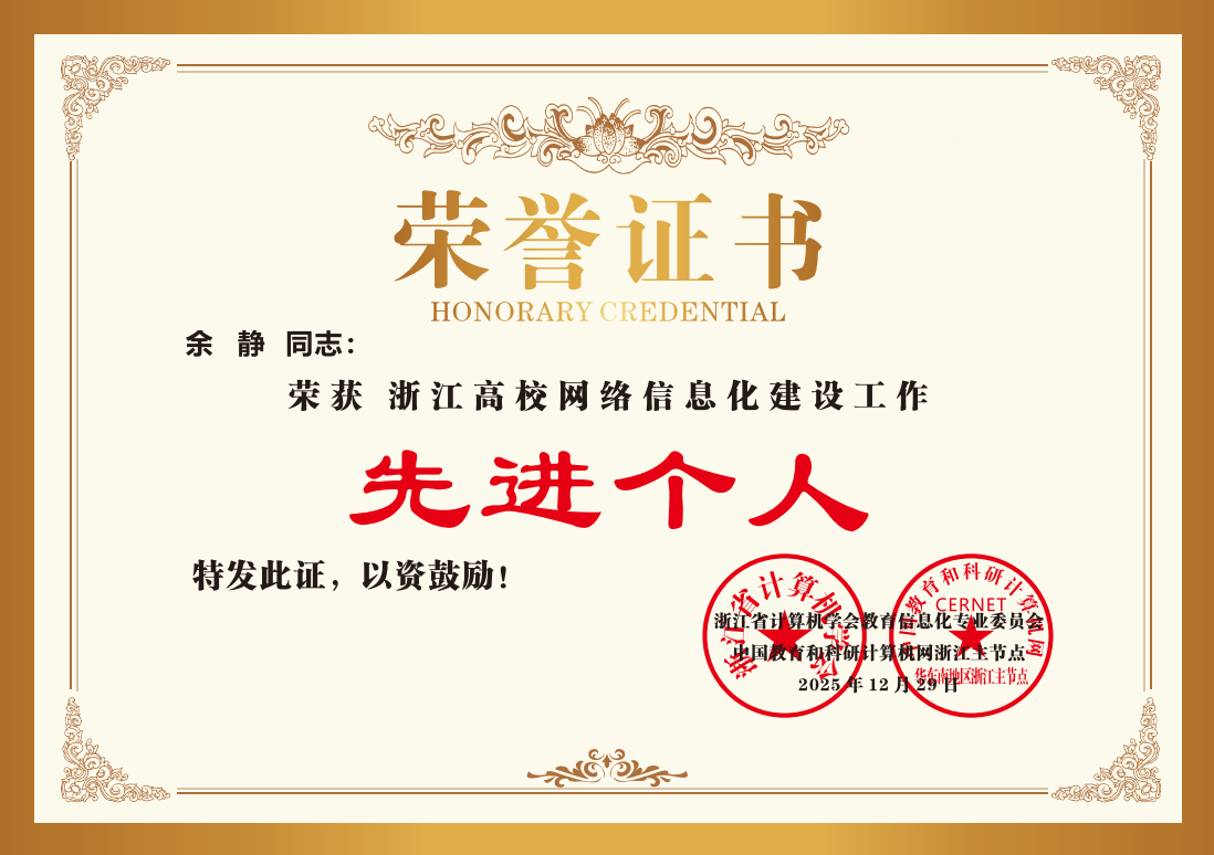 近日,浙江省计算机学会教育信息化专业委员会、中国教育和科研计算机网华东南地区浙江省主节点联合表彰了一批高校网络信息化建设先进单位和先进个人。我校荣获“浙江高校网络信息化建设工作先进单位-人工智能+高等教育创新实践”,余静老师获评“浙江高校网络信息化建设工作先进个人”。